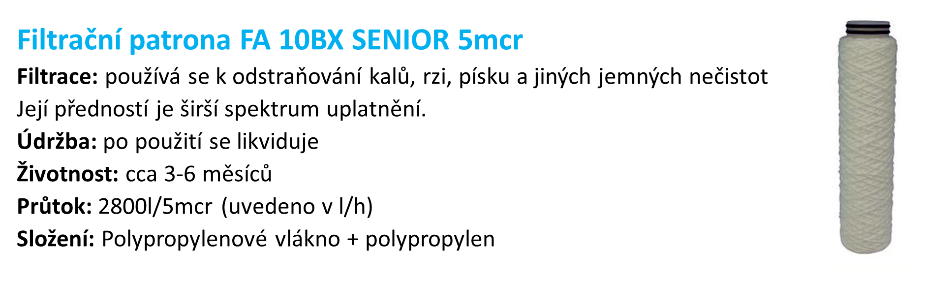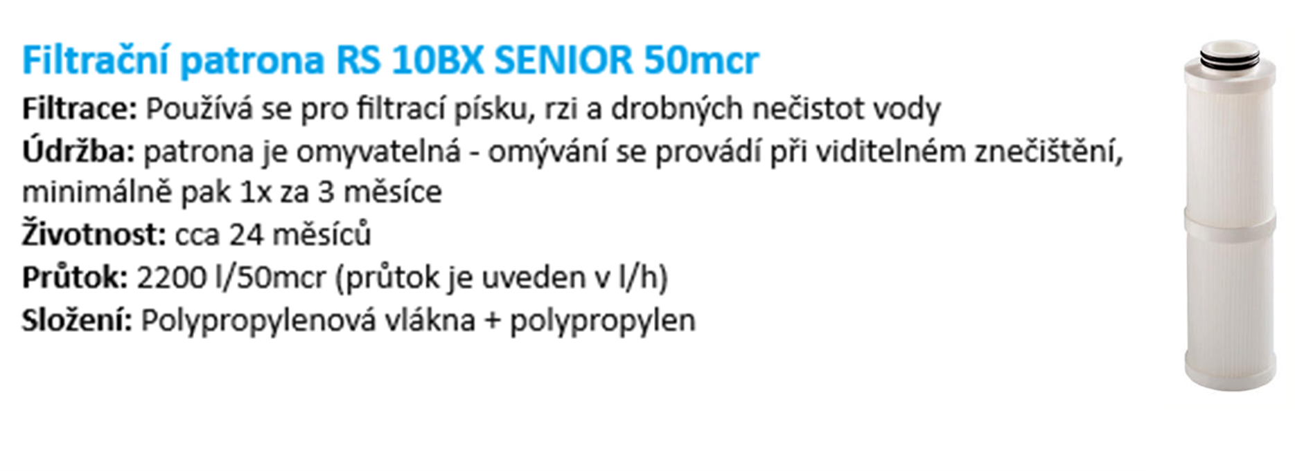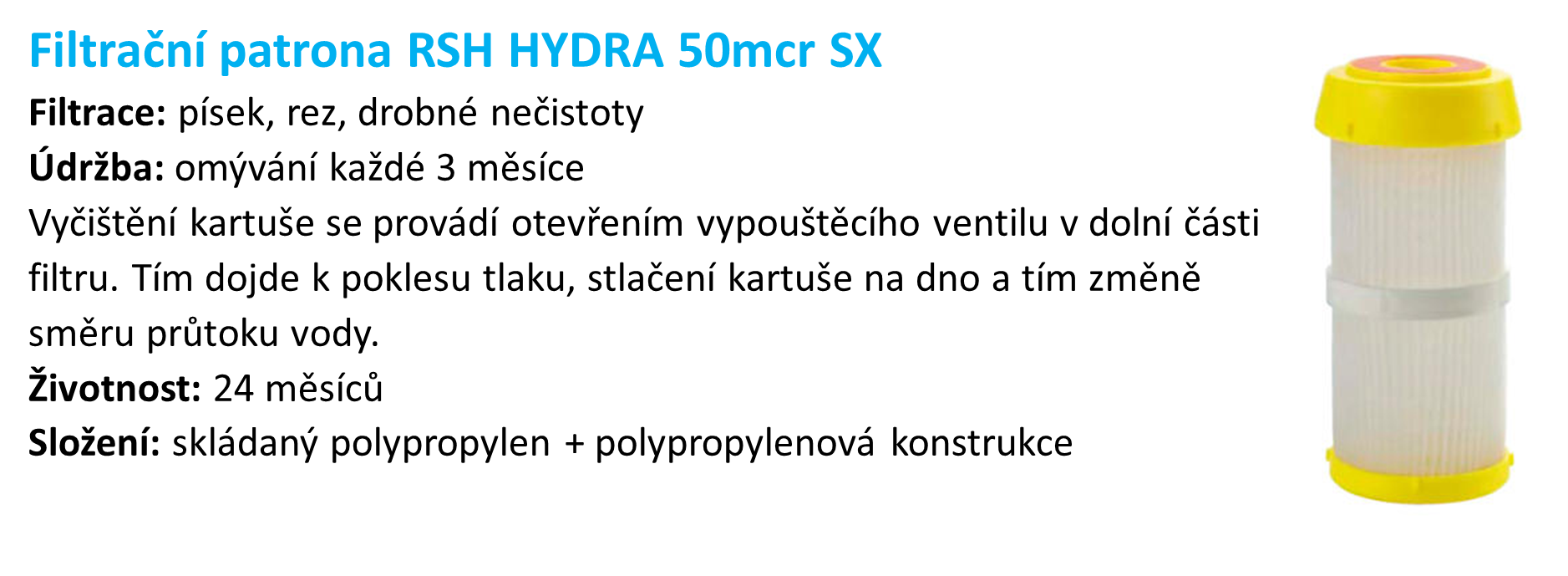 Složení filtrační patrony ve filtru HYDRA- skládáný polypropylen + polypropylenová konstukce. Povrchová úprava filtrační patrony 50 mcr.