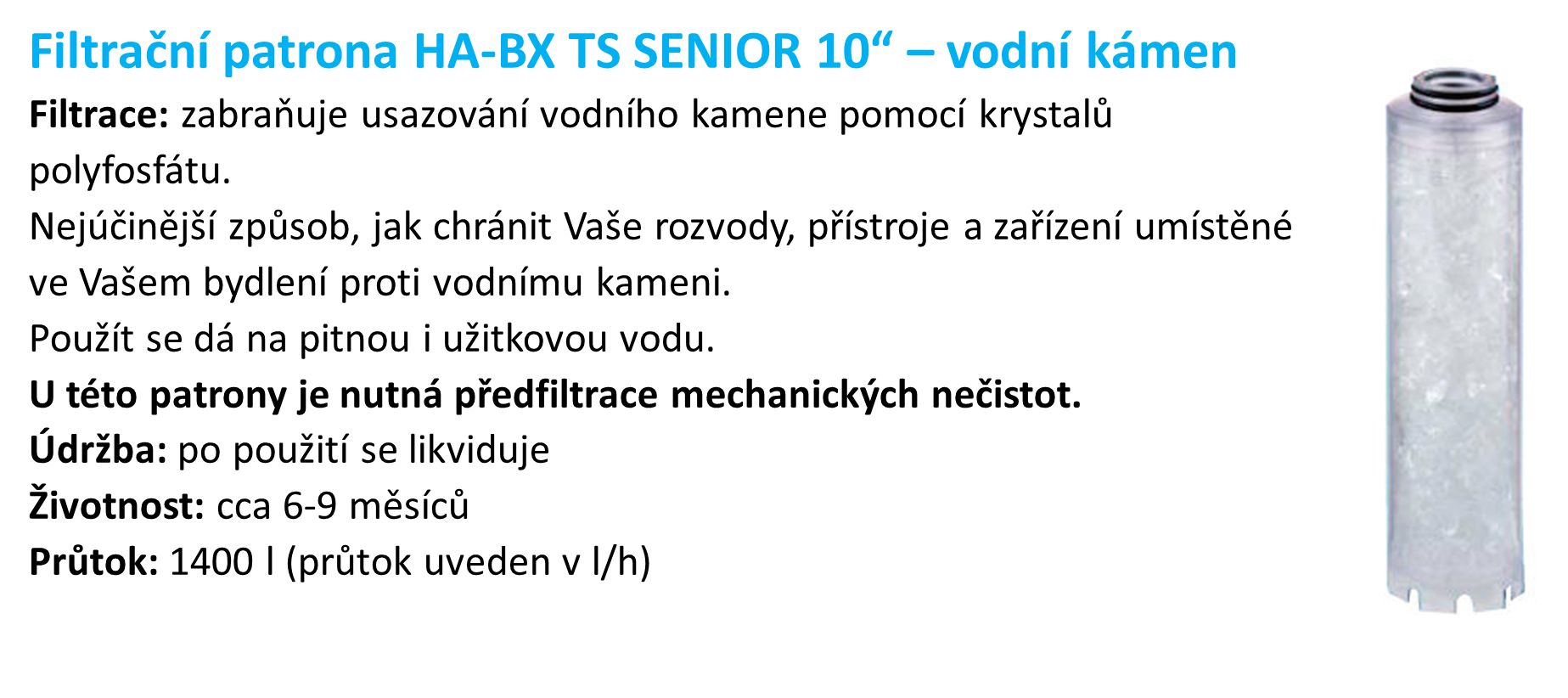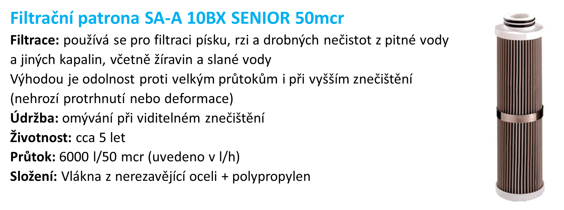 Filtr se hodí i pro použití do bytových jednotek na přívod pitné vody. Součástí filtru je i držák a klíč na povolování nádob. Předností tohoto filtračního setu je samočistící filtr se zpětným proplachem. Samočistící proces kartuše nastává v momentě, kdy je tlak na výstupu o 1 bar nižší než na vstupu. Odstranění nečistot z kartuše je vysoce účinné. Kartuši lze čistit i manuálně. Vyčištění kartuše se zpětným proplachem se provádí otevřením vypouštěcího ventilu ve spodní části filtru, čímž dojde k poklesu tlaku, stlačení kartuše na dno, a tím ke změně směru průtoku vody. Proti proud odstraní veškeré nečistoty usazené na vnější straně kartuše, ty následně odtečou výpustí.